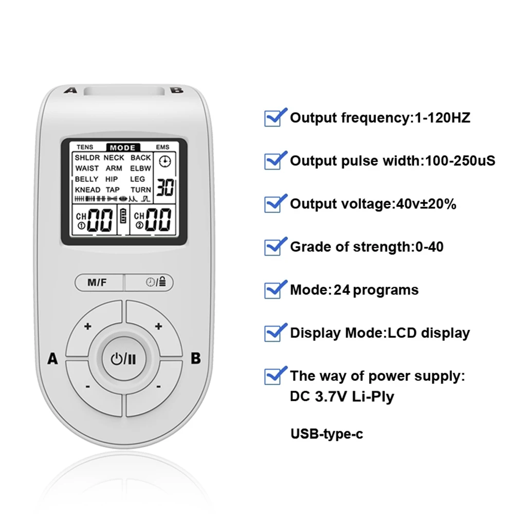 1.TENS/EMS dual pulse frequency, 24 working modes, 40 levels of adjustable intensity, suitable for massaging multiple parts of the body such as waist, abdomen, legs, arms, shoulders, etc., to provide comprehensive care for health.