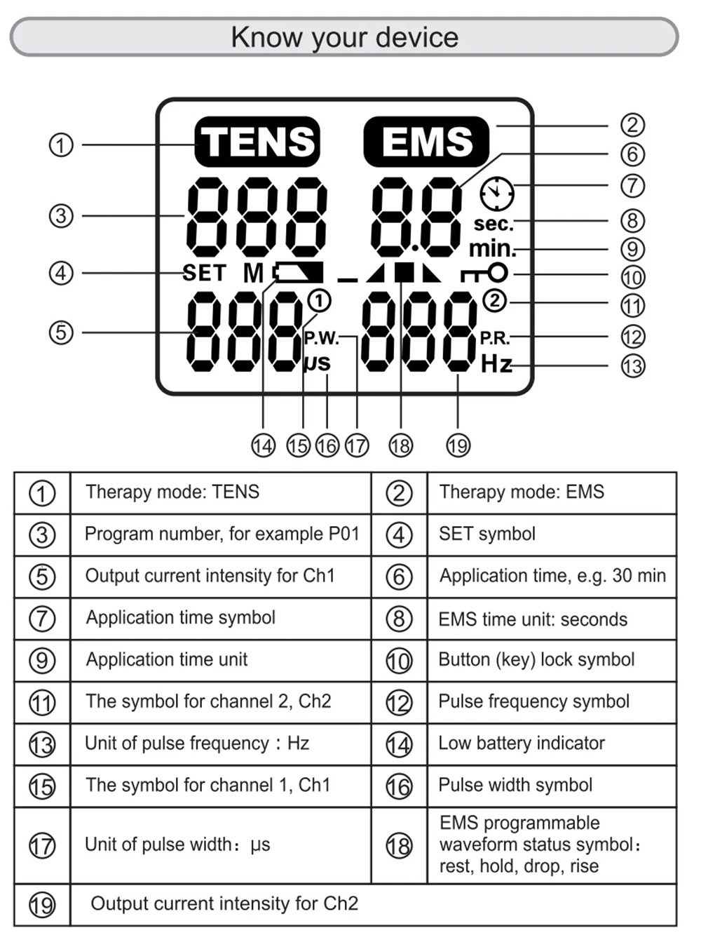 20 fixed TENS programs 、 2 adjustable TENS programs