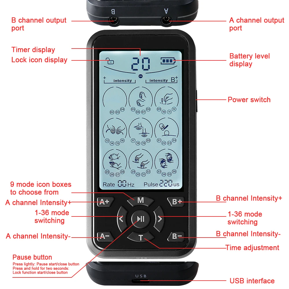 TENS and Muscle Stimulator is a portabeand DC3.7V battery powered mulifunetion device, offering both Transcutaneous Elecrical Nerve Stimulation(TENS)and Powered Muscle Stimulation(PMS)qualities in one device.