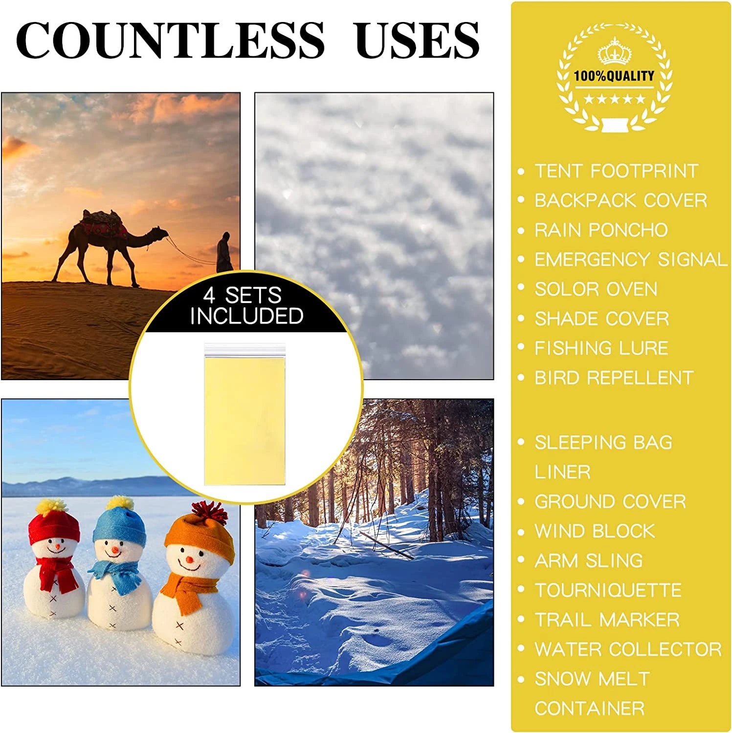 ✔ Gold & silver dual-sided foil – versatile for heat retention and signaling.