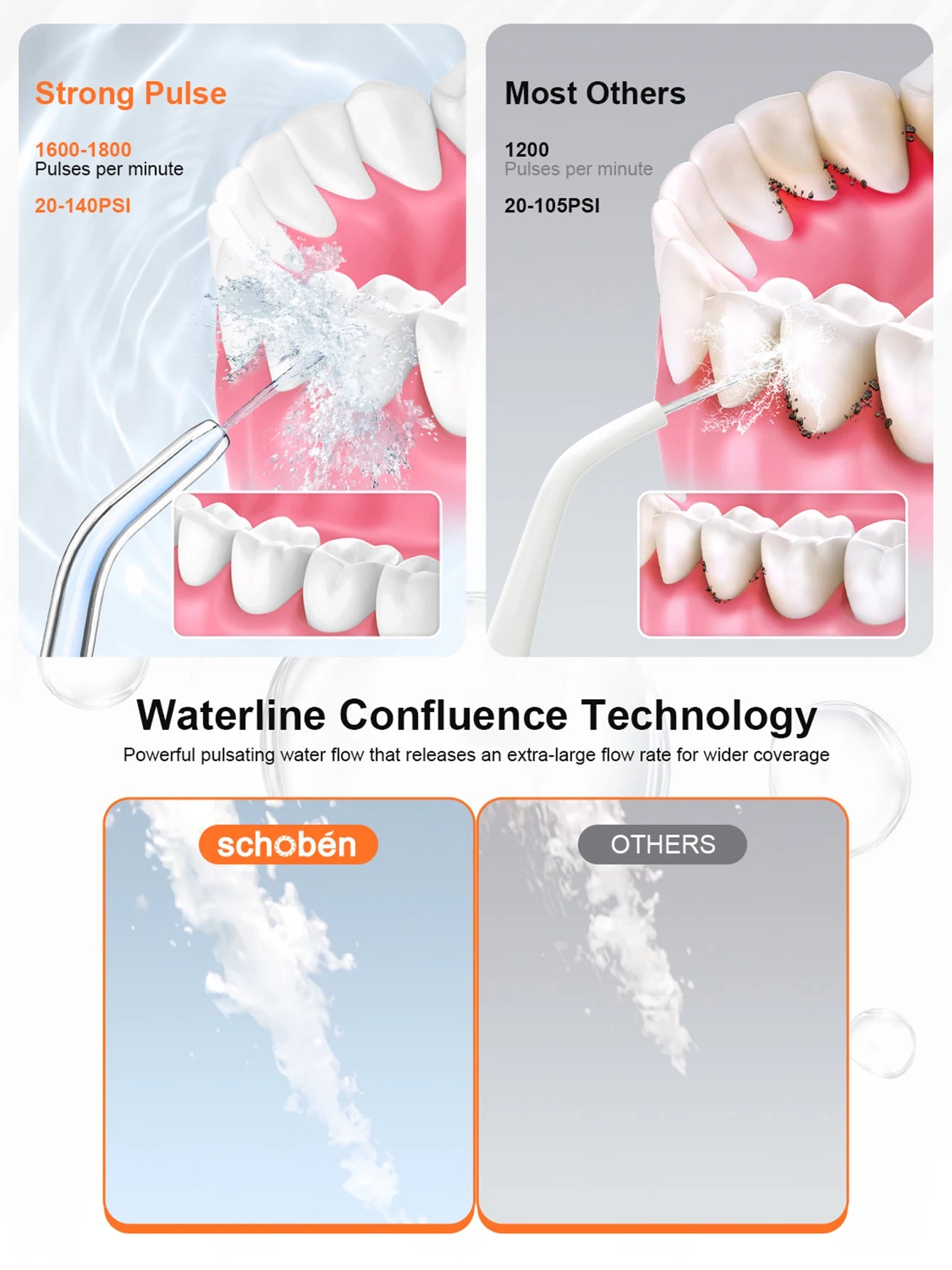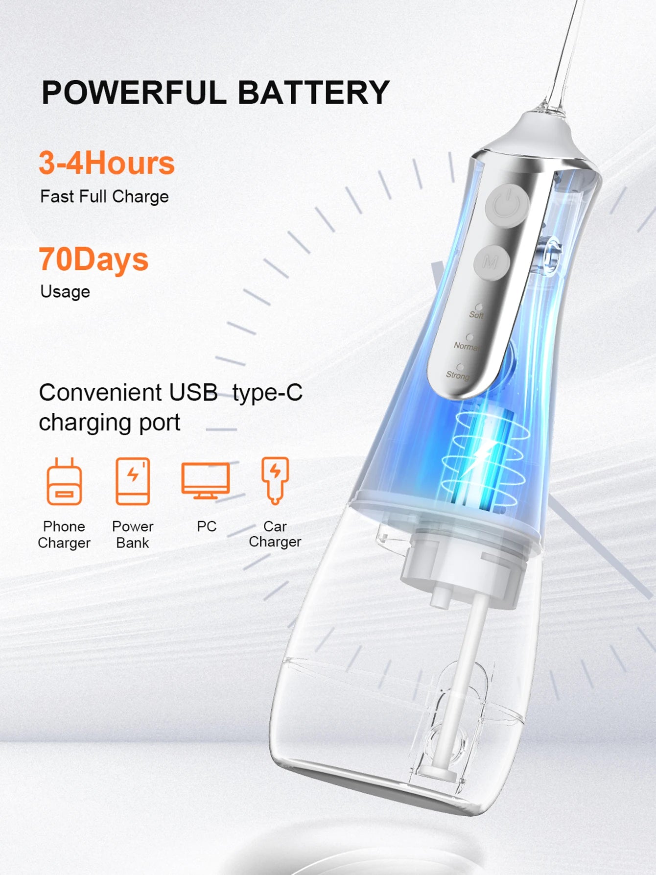 Upgrade your oral care with this cordless, portable water dental flosser designed for effective and convenient teeth cleaning. Featuring a 260ML water tank, it offers extended use without frequent refills. The flosser comes with 4 adjustable modes—Gentle, Normal, Strong, and Massage—to customize your cleaning experience according to your needs. Equipped with 4 replaceable nozzles, this device suits multiple users or different cleaning purposes such as braces, implants, and sensitive gums. Its rechargeable battery ensures long-lasting power, making it perfect for home use and travel. Lightweight and easy to handle, this oral irrigator promotes healthier gums, fresher breath, and a brighter smile.