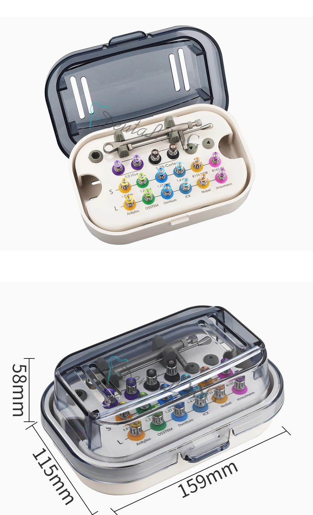 🔧 16pcs screwdriver heads – universal fit for various implant systems.