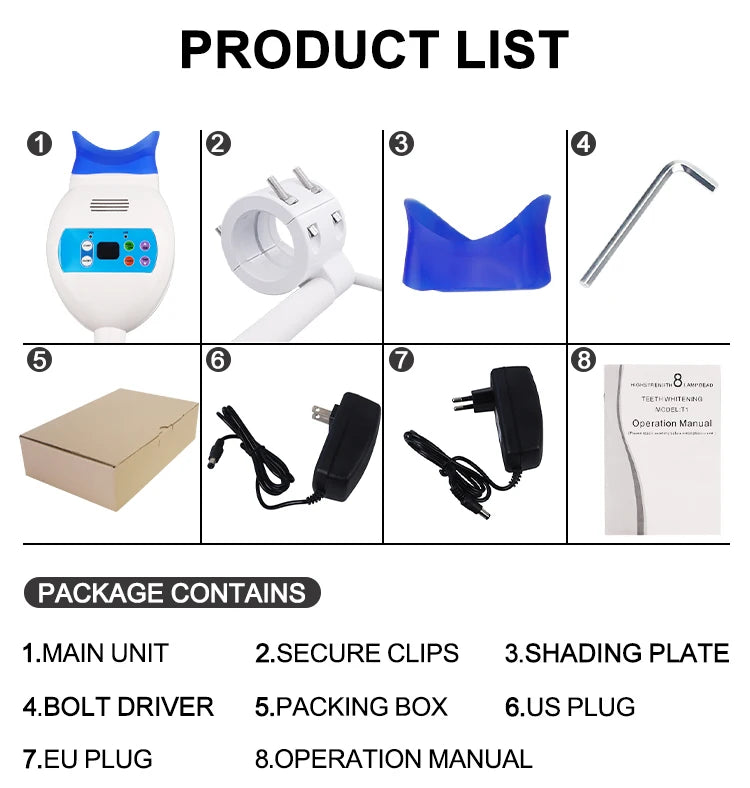 Featuring a stable center pillar design for easy adjustment and secure positioning, this whitening lamp is ideal for dental clinics, beauty salons, and cosmetic treatment centers. Its non-heat-producing LED system ensures comfort for your patients, making it a reliable tool for professional-level whitening without discomfort.