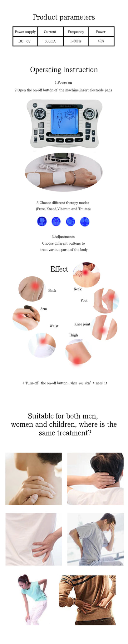 This electronic pulse massager has distinct lenitive therapy function for the symptom of cervical spondyosis, periarthritis humeroscapularis, arthritis, strain of lumbar muscles and etc, and it can alleviate peripheral nerve paralysis effectively. In addition, this machine can bring flexible massage for the whole body due to electrode pads, thus it is very useful to dissipate fatigue, alleviate myalgia and promote blood circulation.