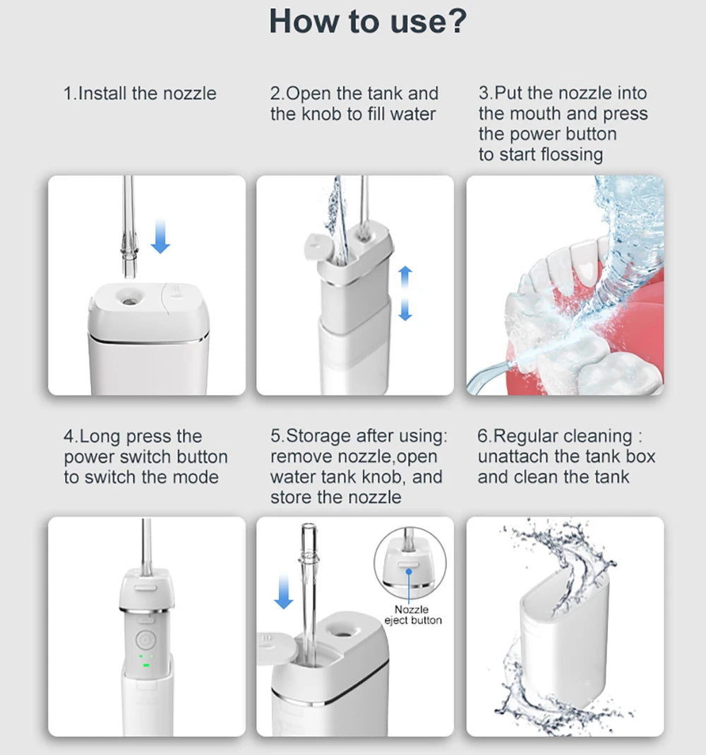 Compact and travel-friendly, this mini dental water flosser is perfect for home use, vacations, and business trips. Its ergonomic design makes it comfortable to hold, while the strong, adjustable water pressure ensures a personalized and effective clean for healthier teeth and gums.