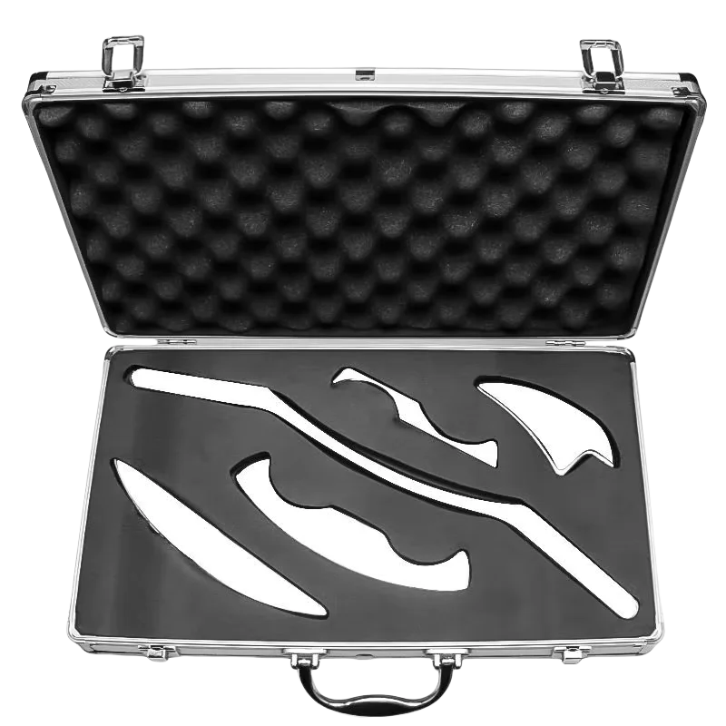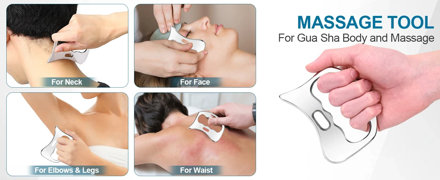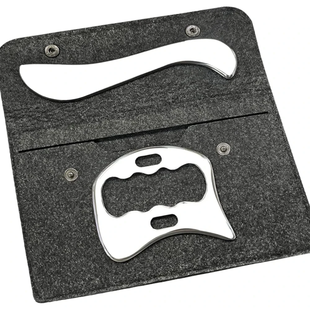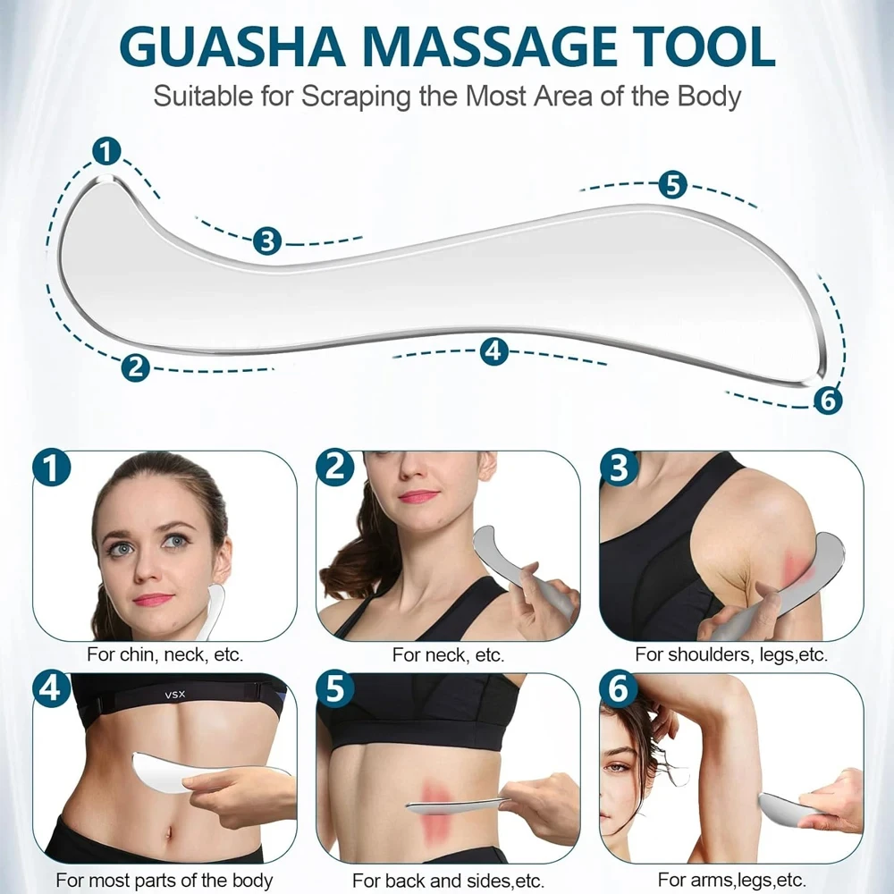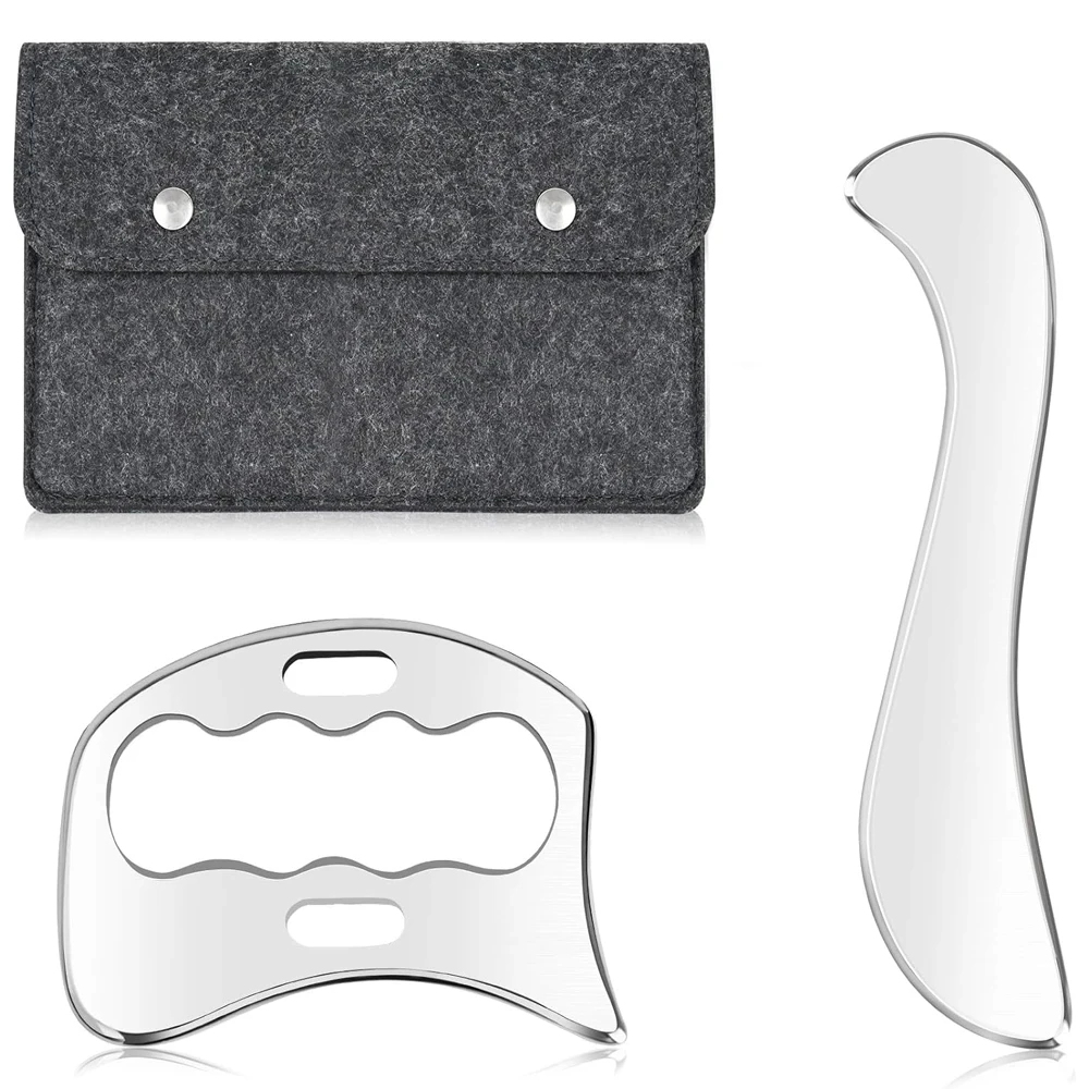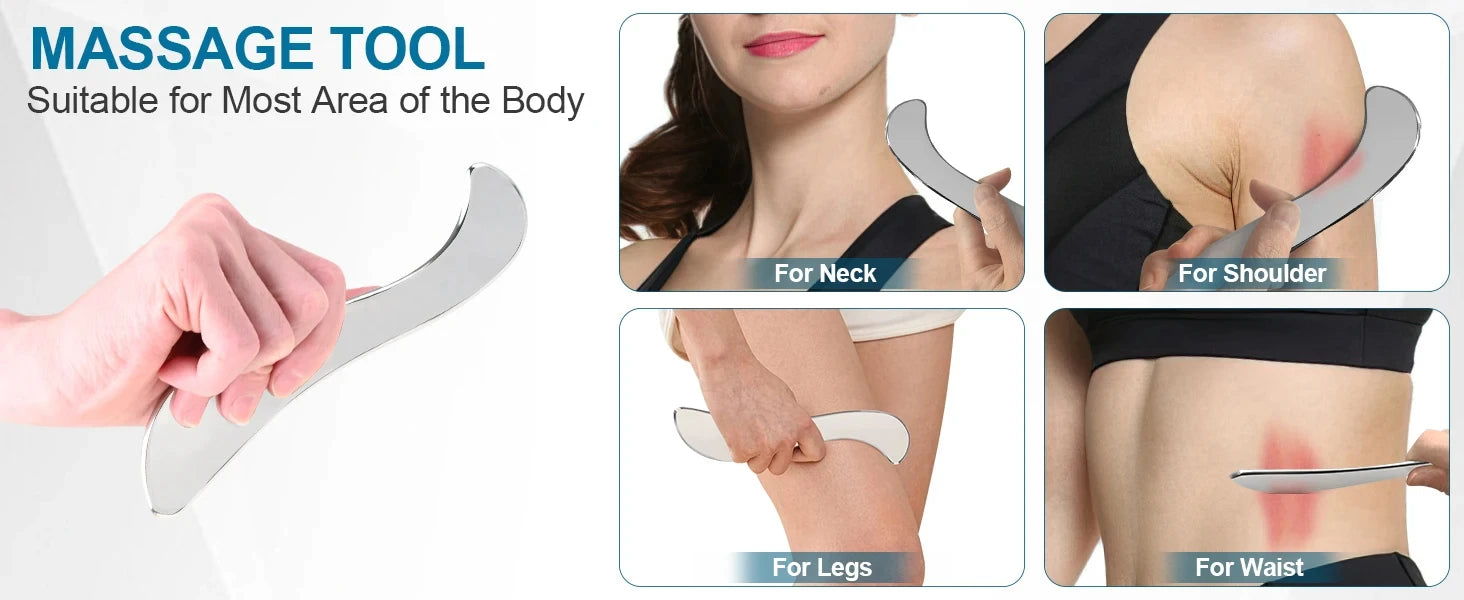 1. This Stainless Steel Muscle Scraper Tool set can help relieve muscle pain, Soreness and tension, break soft tissue adhesion and fascia limitation, Promote blood circulation,Stimulate regional red blood cell renewal,And enhance skin elasticity and tightness by applying pressure on parts, Scraping muscles and scraping massage.